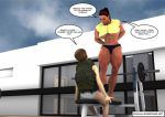 After the pizza night, Angela wants to see Tom again as soon as possible, so the female bodybuilder invites the other three to her house for a little swimming pool party. Angela asks Tom to cover her big back with sunblock, and later lifts him out of the water with her strong arms. Katie too has her fun, first throwing Nathan in the water, and later wrestling the two guys at the same time.